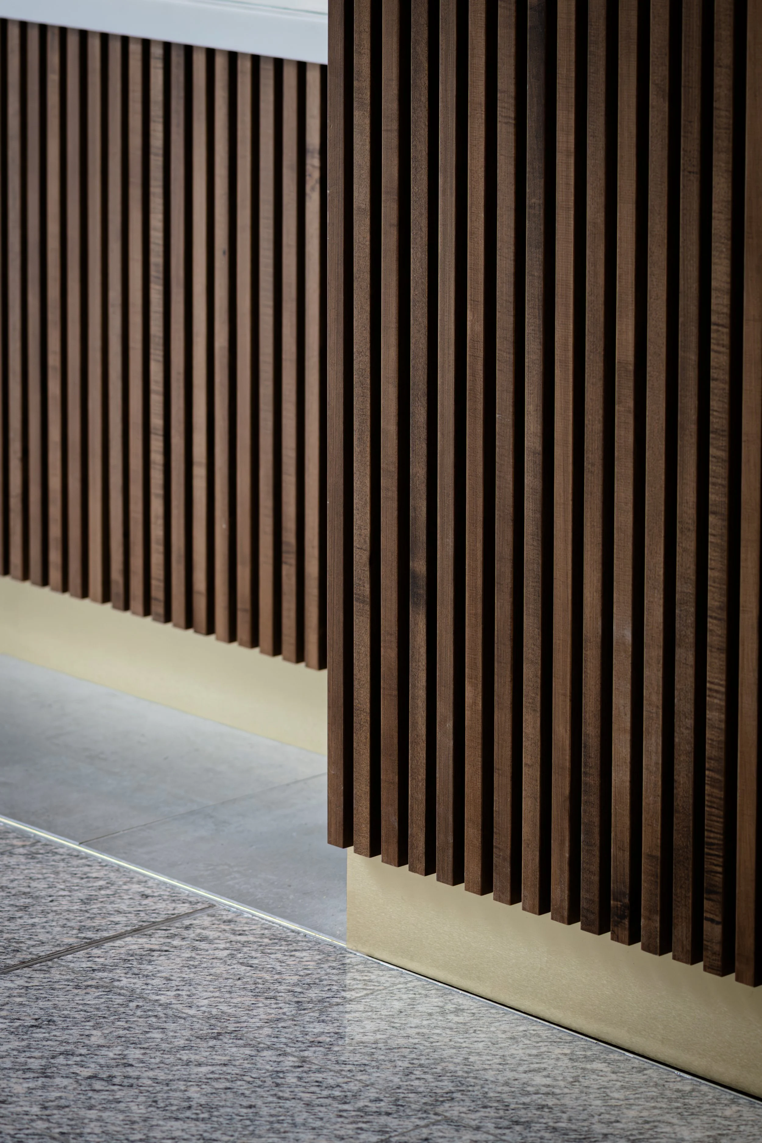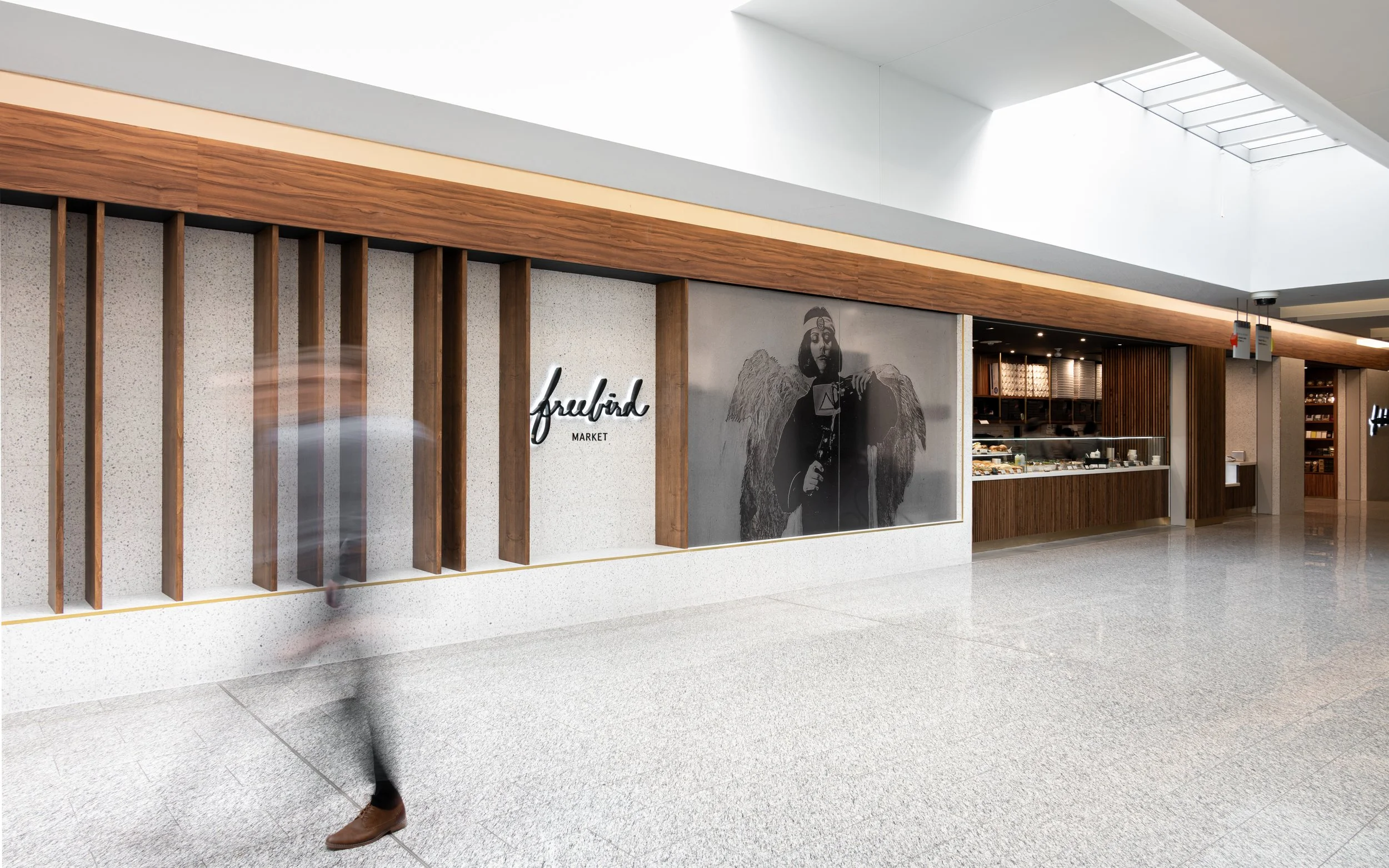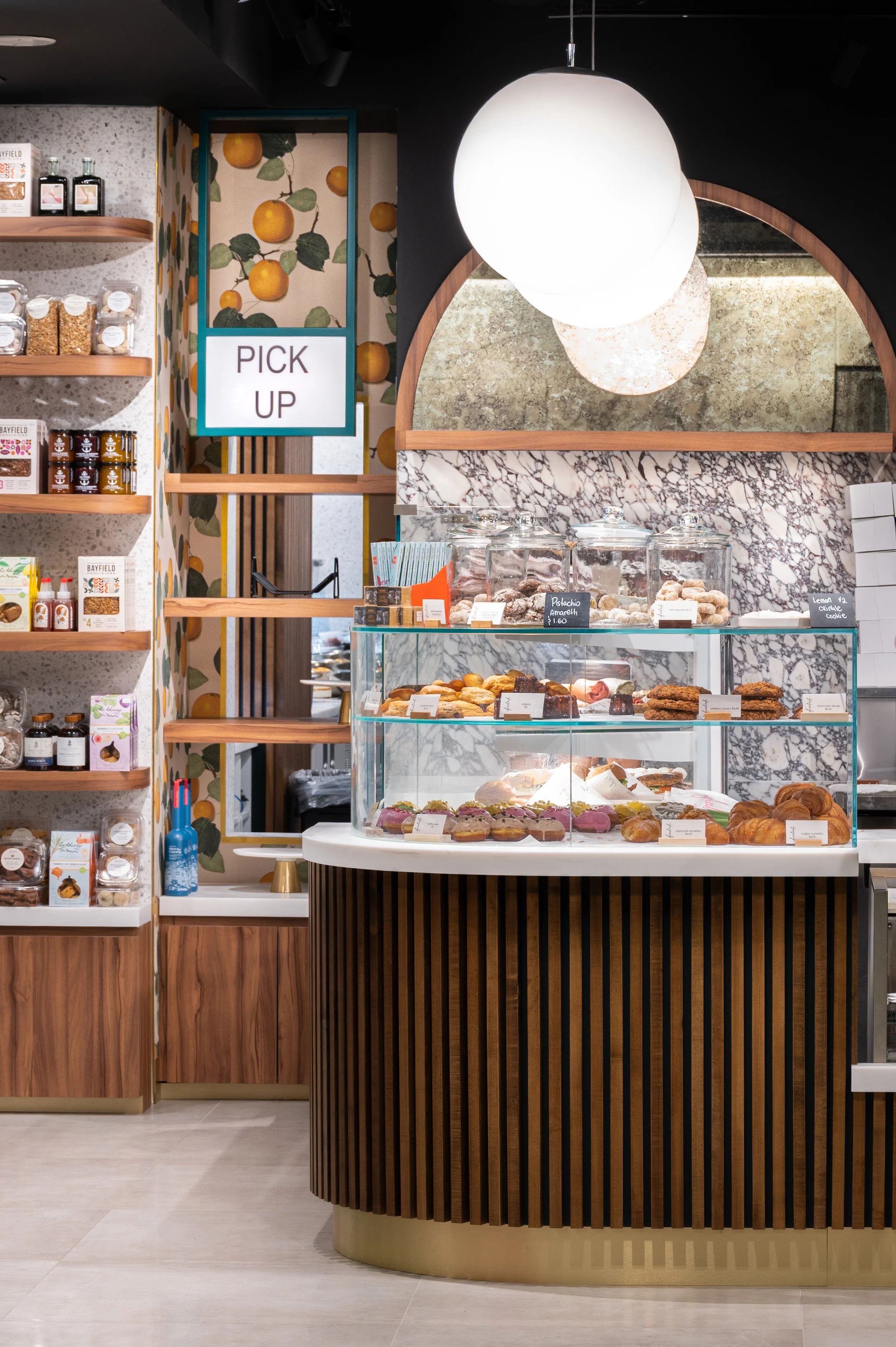 The dual-sided market connects its premium offerings in a very welcoming way through warm wood paneling, brass detailing, and colorful undertones that transition all throughout the store.